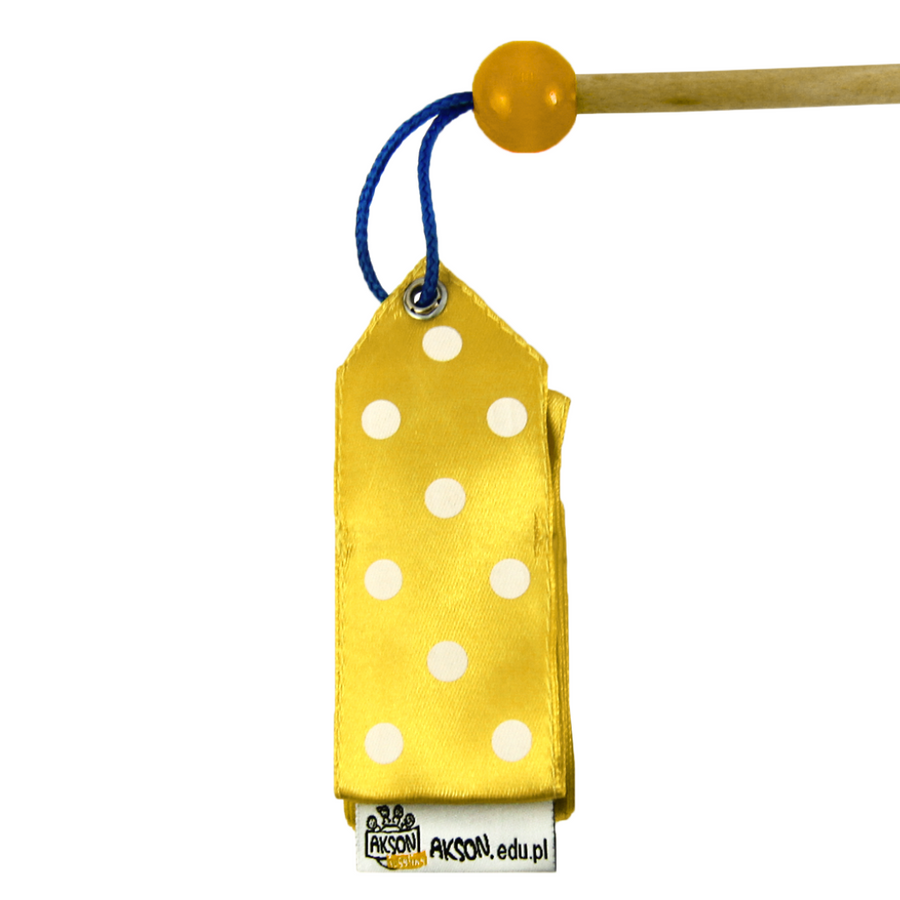Materiał połączony jest z drewnianą tyczką kolorowym sznureczkiem, a tyczka zakończona jest po obu stronach drewnianymi kulkami, dzięki czemu wstążka idealnie pasuje do małych rączek i jest wygodna w użytkowaniu.