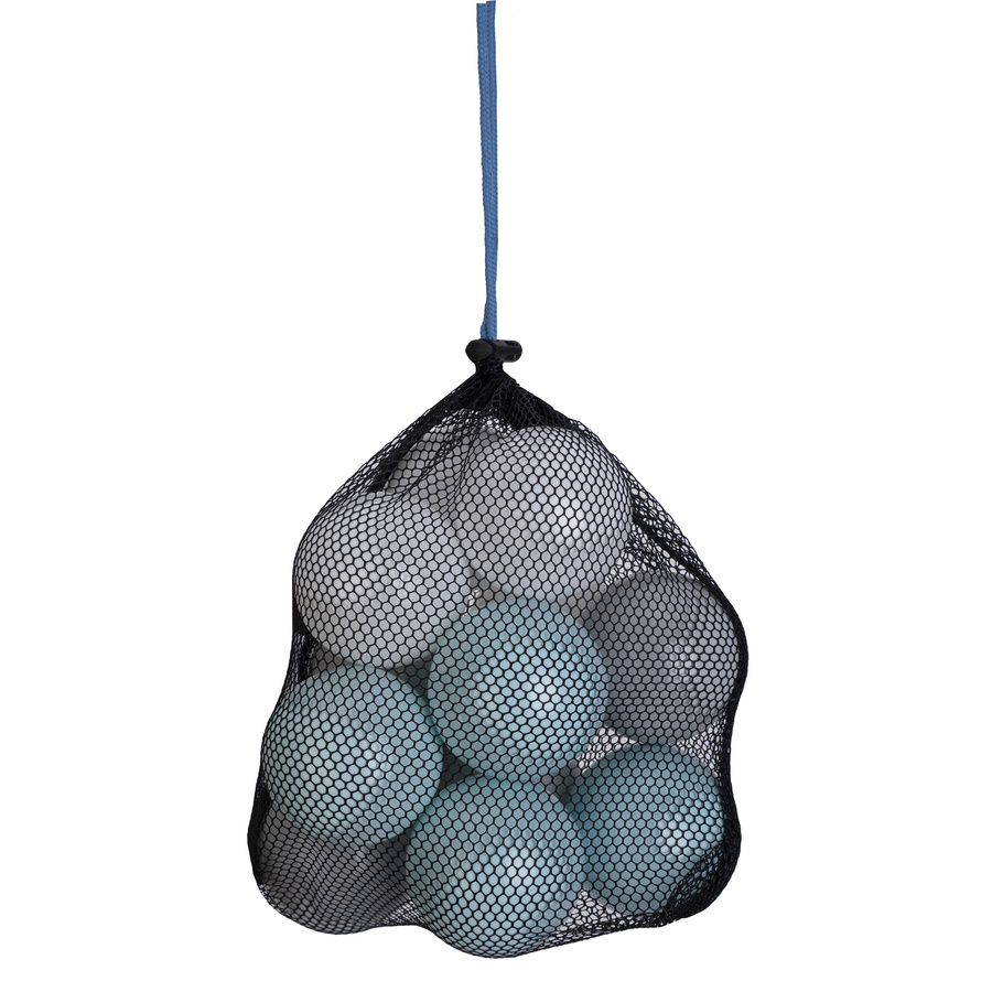 Piłeczki zapakowane w praktyczny worek z siateczki zamykany za pomocą sznurka ze ściągaczem.