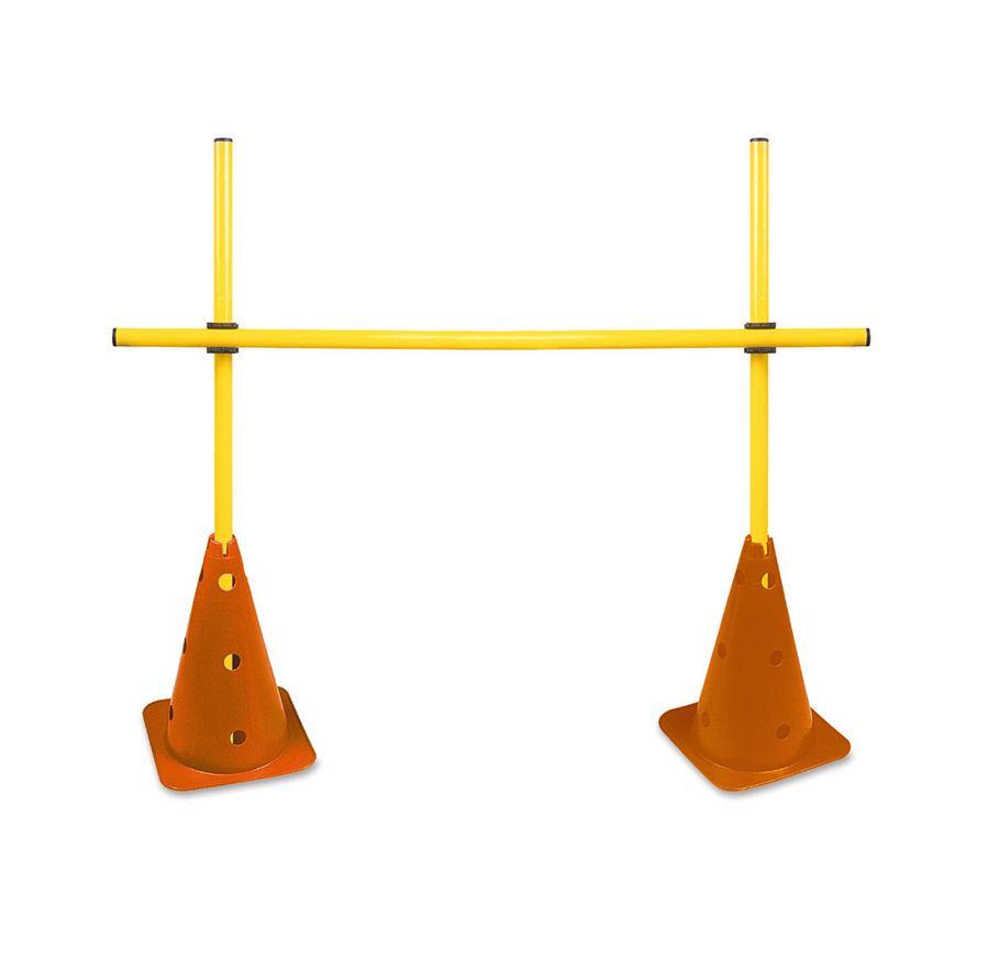 Zestaw składa się z 2 pachołków w kolorze pomarańczowym , 2 tyczek standardowych i 1 tyczki poprzecznej w kolorze żółtym.