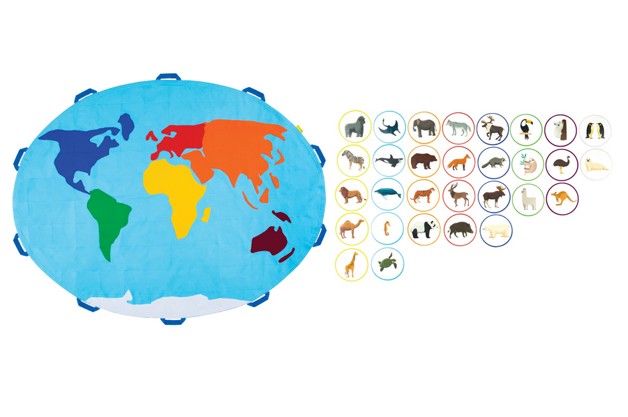 Nasza chusta edukacyjna mapa świata to wyjątkowe narzędzie, łączące edukację z zabawą. Chusta w kształcie elipsy, obszyta jest wytrzymałą taśmą nośną i posiada 10 wzmacnianych uchwytów, które rozszerzają możliwości animacji i zabaw. Może być używana jako mata rozłożona ziemi, jak i typowa chusta animacyjna. Dzięki uchwytom łatwo trzymać chustę w dłoniach lub przymocować matę do podłoża, a dodatkowe wzmocnienie materiałem zwiększa jej trwałość.