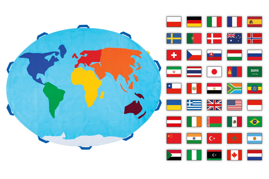 Nasza chusta edukacyjna mapa świata to wyjątkowe narzędzie, łączące edukację z zabawą. Chusta w kształcie elipsy, obszyta jest wytrzymałą taśmą nośną i posiada 10 wzmacnianych uchwytów, które rozszerzają możliwości animacji i zabaw. Może być używana jako mata rozłożona ziemi, jak i typowa chusta animacyjna. Dzięki uchwytom łatwo trzymać chustę w dłoniach lub przymocować matę do podłoża, a dodatkowe wzmocnienie materiałem zwiększa jej trwałość.