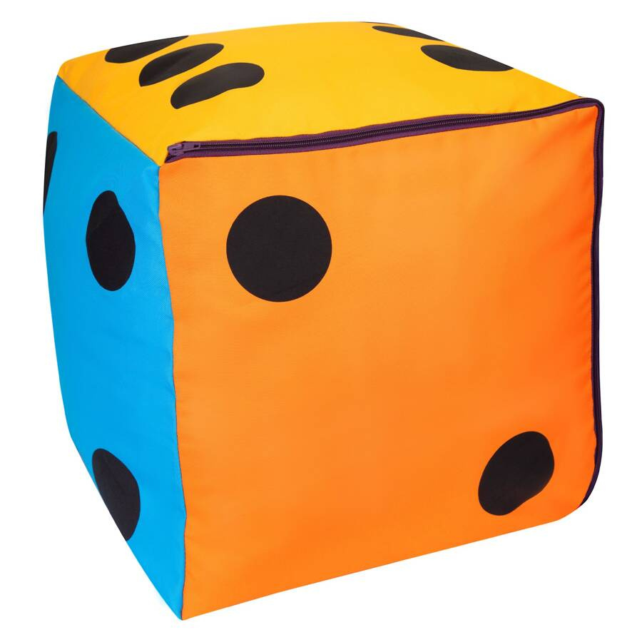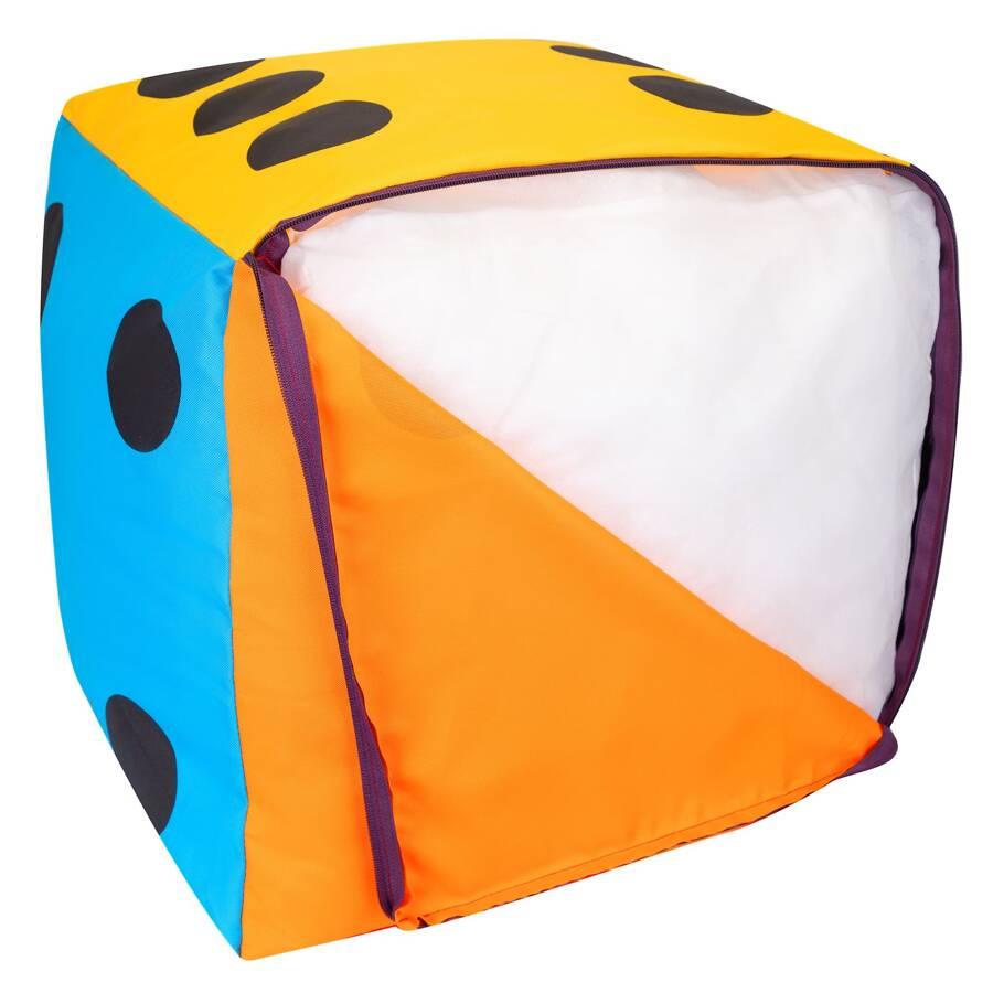 Kostka posiada sześć różnych kolorowych ścian, każda z inną liczbą kropek, co pobudza wyobraźnię i rozwija umiejętności poznawcze. Dzięki miękkiemu wypełnieniu jest nie tylko bezpieczna, ale także przyjemna w dotyku, co umożliwia wygodne siedzenie, leżenie, turlańce czy zabawy w plenerze. Jest to również doskonała pomoc do organizacji gier zespołowych i integracyjnych, sprzyjających aktywności fizycznej w grupach.