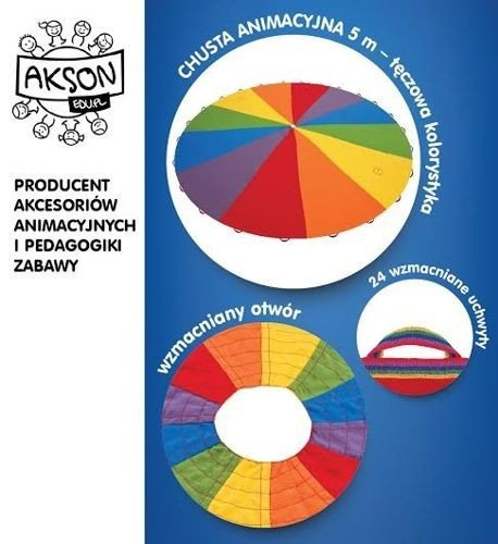 Co to chusta animacyjna? Chusta animacyjna Akson to starannie przemyślany produkt, który przyciąga uwagę, pobudza kreatywność i inspiruje do ruchu zarówno dzieci, jak i dorosłych. Chusta wykonana jest z wysokiej jakości kolorowego materiału o gramaturze 108g/m2, ma 5 m średnicy, wzmocnione brzegi oraz 24 tęczowe uchwyty, umożliwiające tworzenie niezapomnianych zabaw z różnymi akcesoriami i nie tylko!