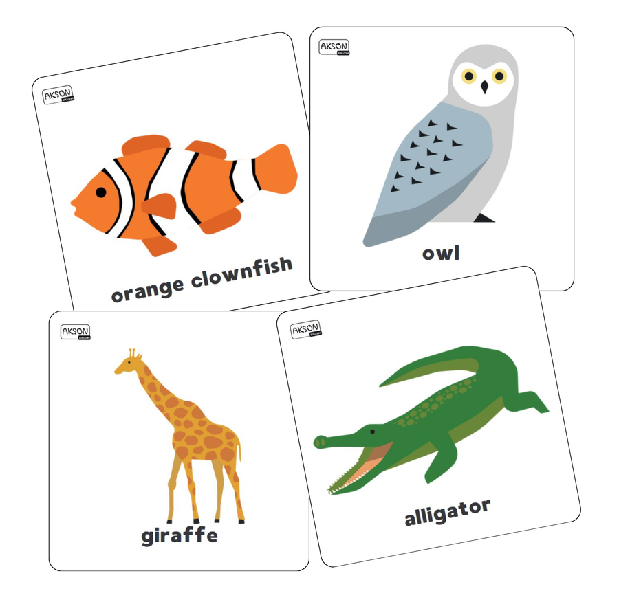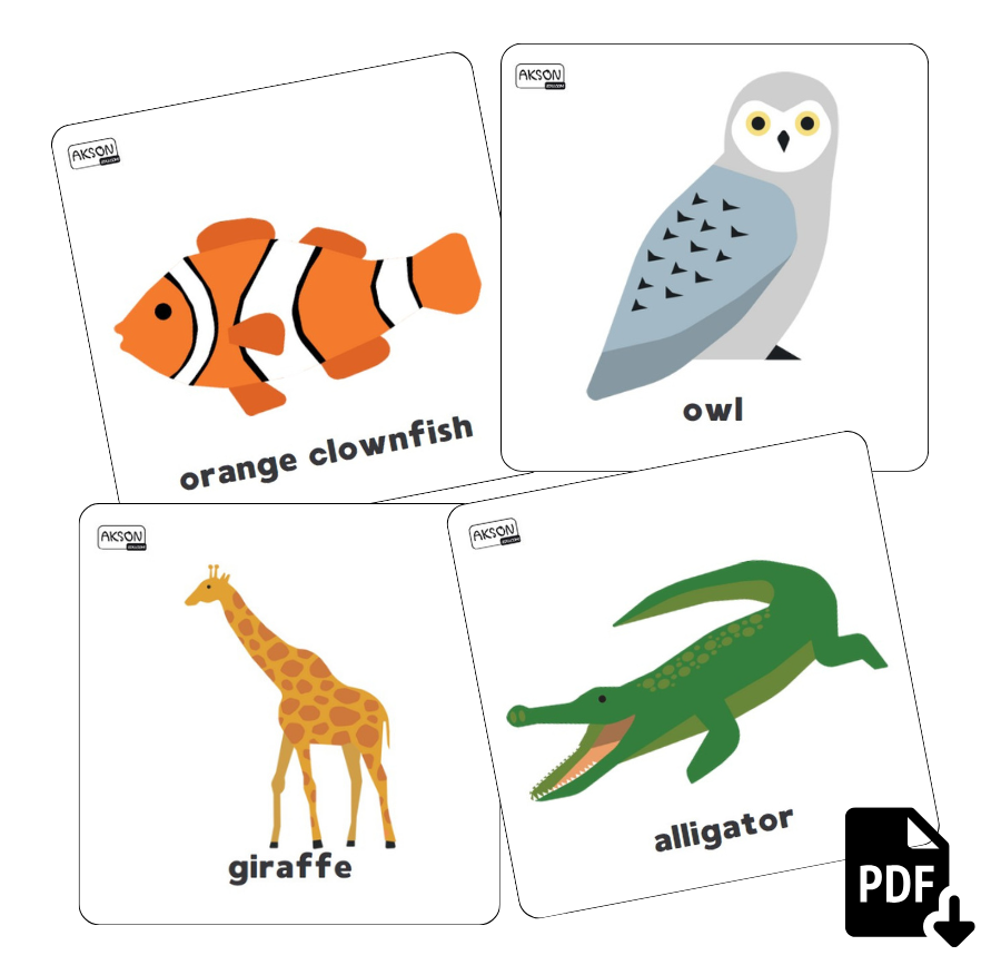 Zestaw zawiera 78 gotowych do wydruku kart. Na kartach znajdziesz kolorowe zwierzęta z całego świata, wraz z ich nazwami po angielsku.