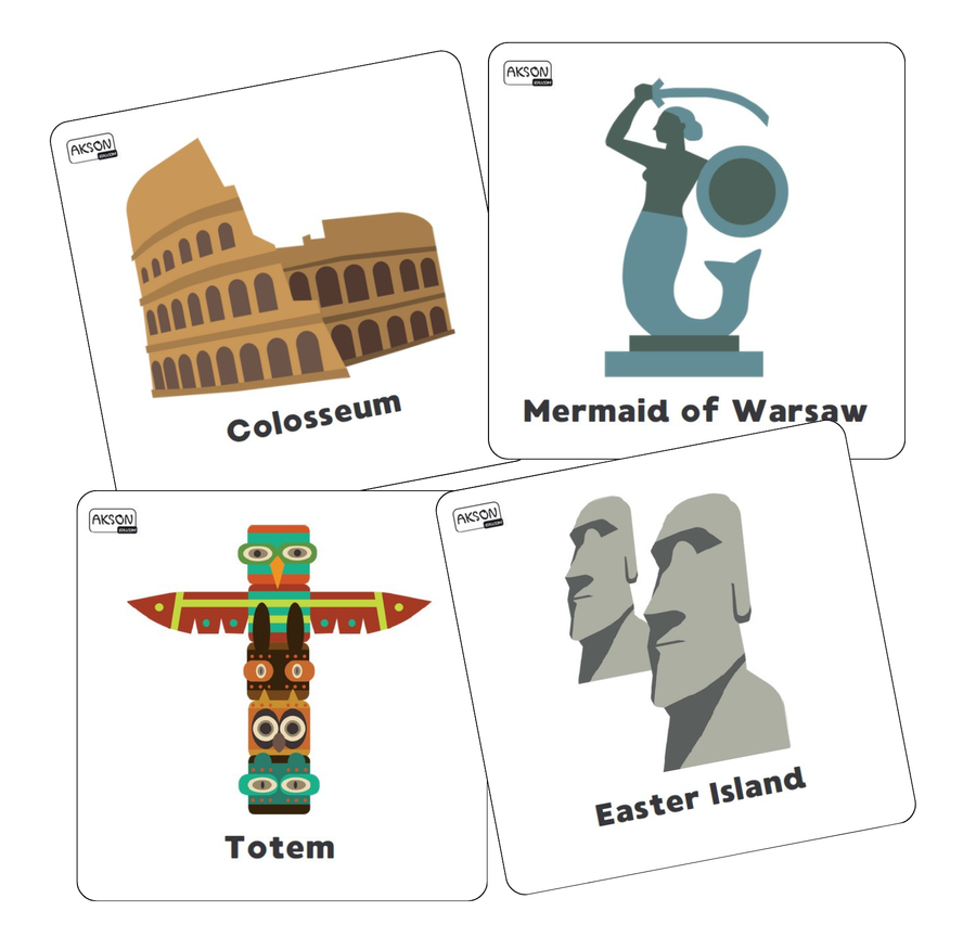 • Karty przedstawiają kolorowe rysunki zabytków , wraz z ich angielskimi nazwami, występującymi na całym świecie.