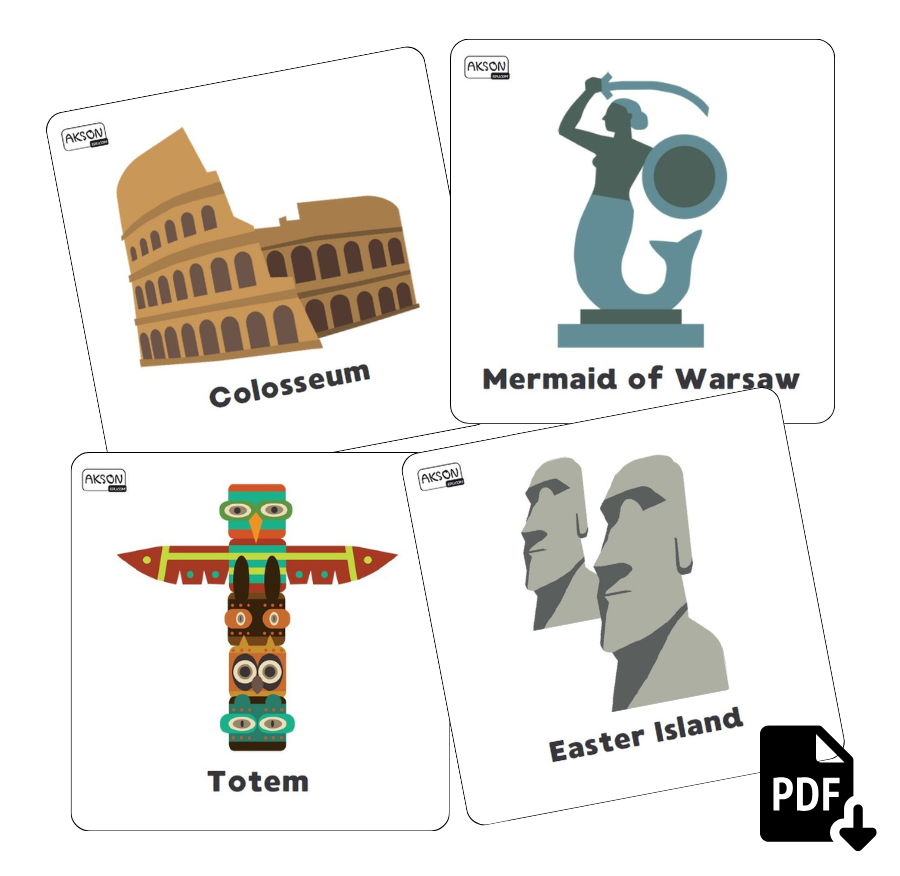 Zestaw zawiera 52 gotowe do wydruku karty. Na kartach znajdziesz kolorowe rysunki zabytków z całego świata, wraz z ich nazwami po angielsku.
