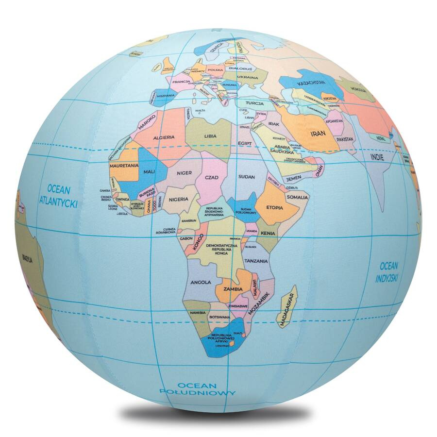 Jedyna taka, niepowtarzalna piłka globus z zaznaczonymi państwami świata oraz ich nazwami w języku polskim.