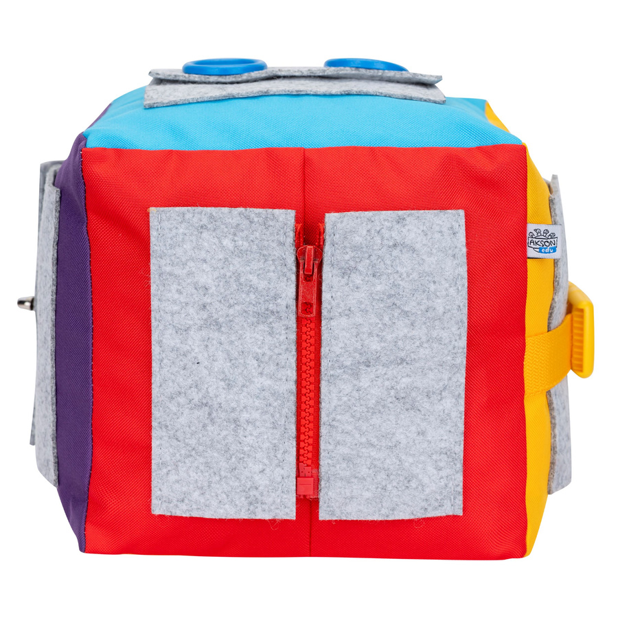 - Kieszonki: Każda ścianka kostki zawiera kieszonkę, zachęcające dziecko do wkładania i wyjmowania przedmiotów, co rozwija koordynację ręka-oko.