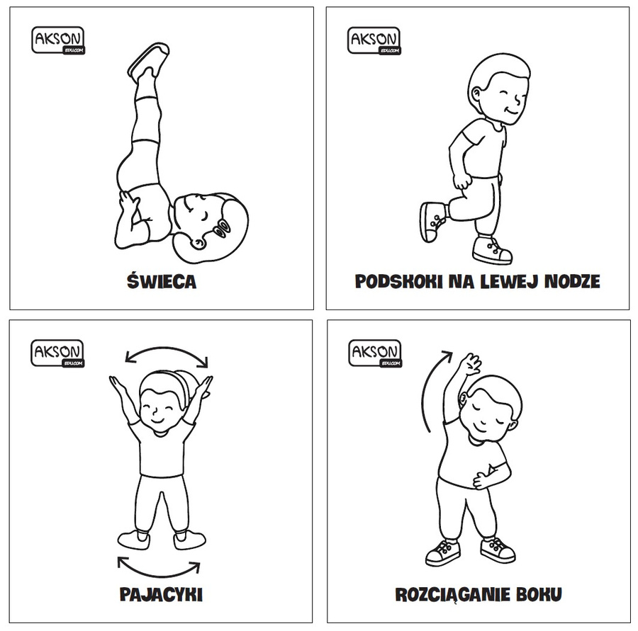 Zestaw zawiera 20 kart. Na kartach znajdziesz grafikę przedstawiającą 20 różnych, łatwych ćwiczeń do wykonania podczas rozgrzewki lub innych konkurencji ruchowych.
